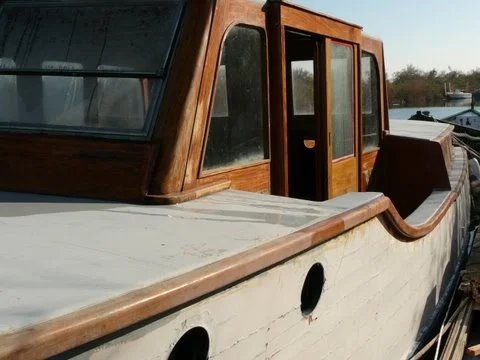 In the aft bulkhead, up one step, is a door which leads via another step to the aft cockpit. With cream canvas upholstery the cockpit is designed to be a pleasant seating area away from the noise and activity of the wheelhouse. There is substantial underseat storage and the cushions are shaped to allow them to be re-positioned to form an extra bed. Protection from the elements comes from a white canvas cover held by numerous, original, turnbuckles. On the transom are a flagstaff and two original bronze cleats.